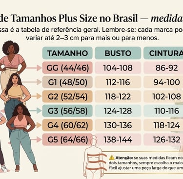 📌 Importante: o tamanho "Plus Size" começa oficialmente no GG (44/46) segundo a ABPS — Associação Brasileira de Plus Size.